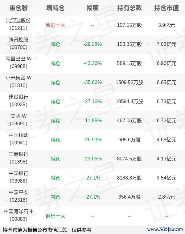 本站消息摩根证券,4月22日易方达基金旗下余海燕 刘依姗管理的易方达恒生中国企业交易型开放式指数基金公布一季报,近1年净值增长率44.28%。与上一季度相比,该基金前十大重仓股新增比亚迪股份;其中腾讯控股持仓占比7.6%,为该基金第一大重仓股;中国海洋石油等退出前十大重仓股;详细数据如下: