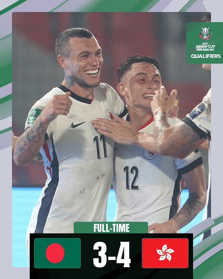 虎扑10月10日讯2025年亚洲杯预选赛第三阶段C组第3轮,中国香港客战孟加拉国,中国香港在一度落后的情况下凭借替补前锋李小恒的帽子戏法,以4比3逆转击败东道主孟加拉国,三轮积7分登上小组头名。